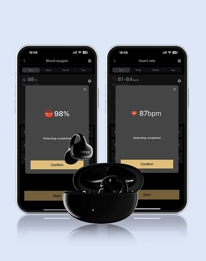 Built-in sensors in each earbud enable heart rate and blood oxygen detection through EDIFIER ConneX App.