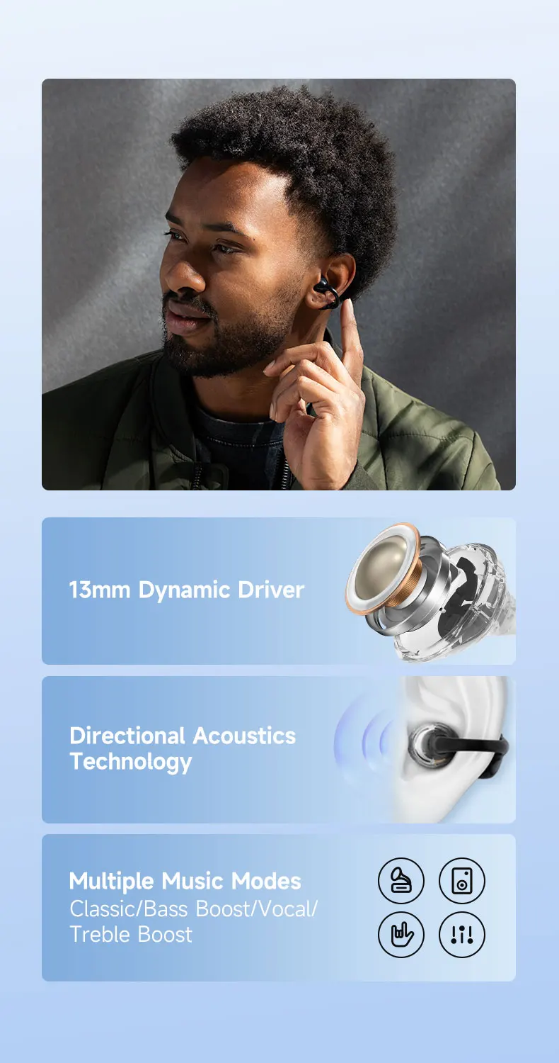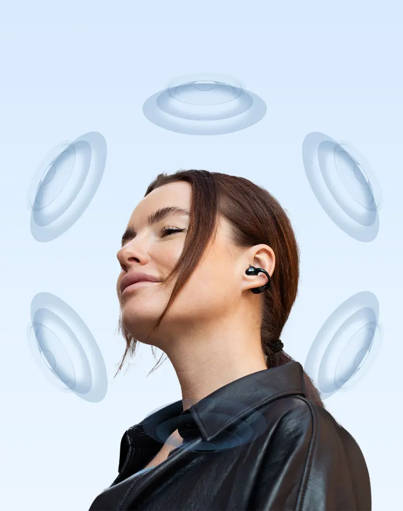 Directional acoustics technology reduces sound leakage in an open-ear design, while the 13mm dynamic driver delivers powerful, high-quality sound with rich detail.