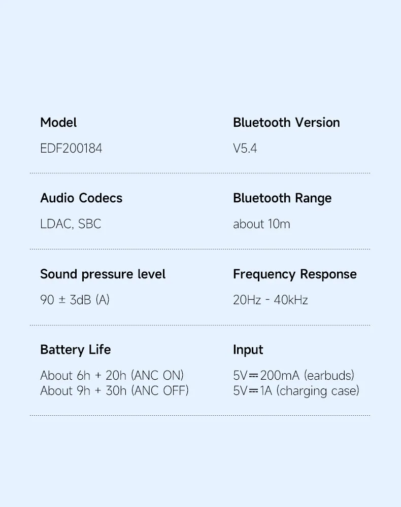 * The battery life data was obtained in the Edifier Lab by testing with SBC decoding and 80% volume. Actual experience may vary slightly depending on the testing environment, equipment, volume, and audio file.